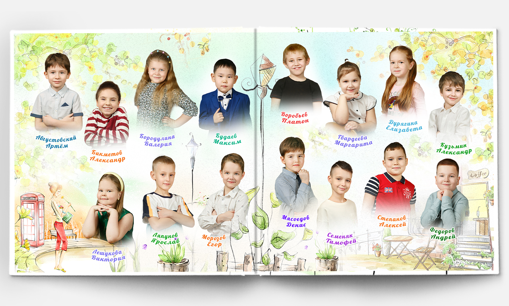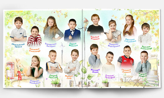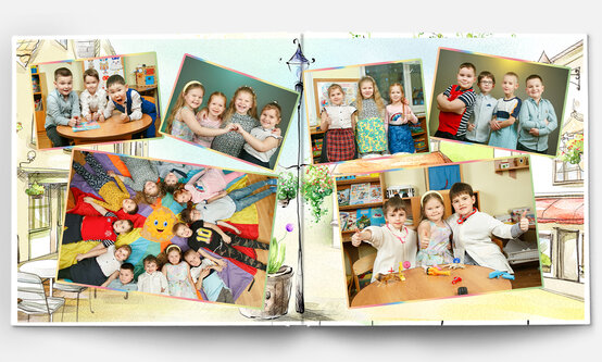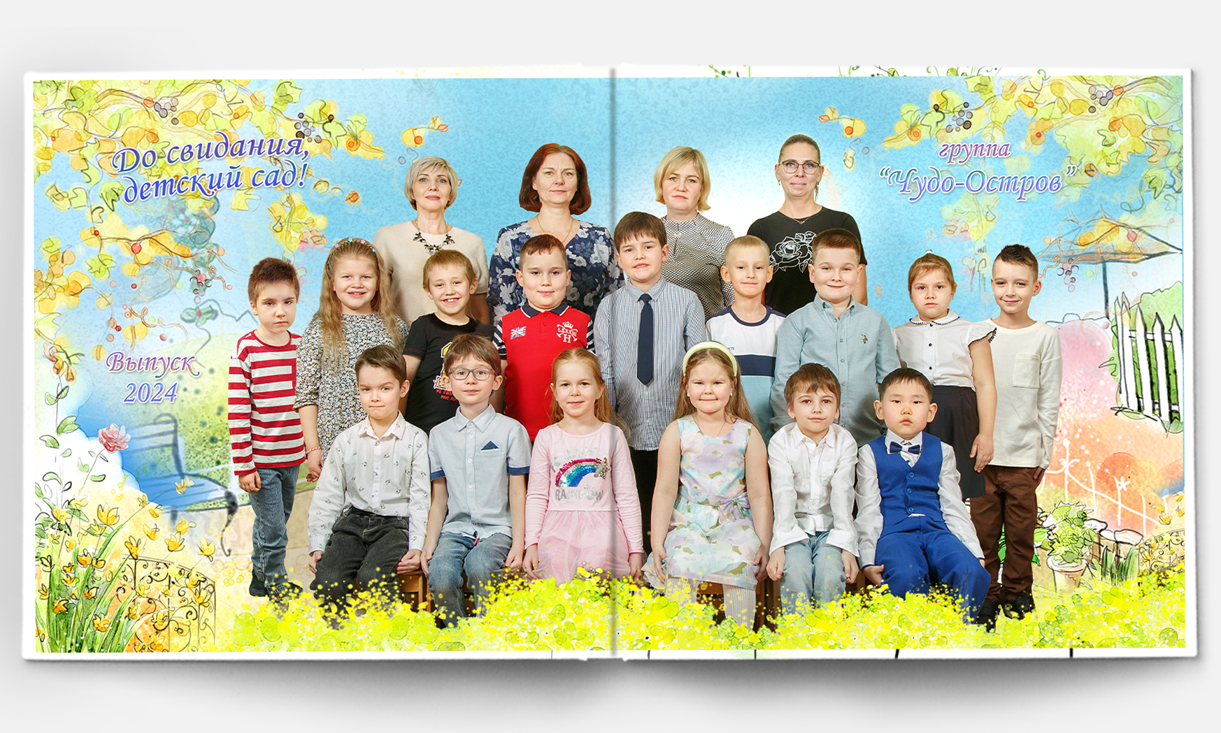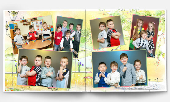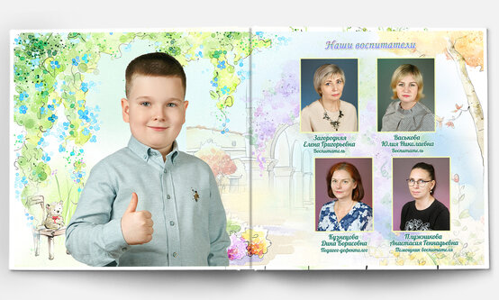 Этот недорогой вариант альбома с минимальным базовым наполнением включает 3 разворота: портреты владельца альбома и воспитателей, фотографии всех детей из группы, коллажи.